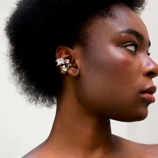 A single piece can change the energy of a look. Jupiter’s blue gold band ring does exactly that. Worn alone or stacked with everyday rings, it adds freshness and depth without feeling excessive. It works just as well next to diamonds as it does alongside simple metal bands, bringing contrast into a familiar stack. The same playful spirit comes through in Defaïence’s lilac earcuff, which introduces color in a subtle, contemporary way. These pieces make dressing feel more enjoyable. They invite experimentation while remaining easy to wear, proving that playfulness and refinement can exist in the same space.